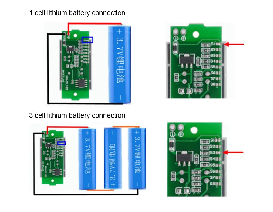 Pro zobrazení stavu baterie, vyberte odpovídající PINy na zdaní straně, a propojte odpovídající dle počtu článků pro správné snímání napětí baterie s odpovídající počtem článků 1S - 8S. Propojte pouze jednu volbu S1-S8, není povoleno 2 nebo více současných propojení (zkratů) současně.