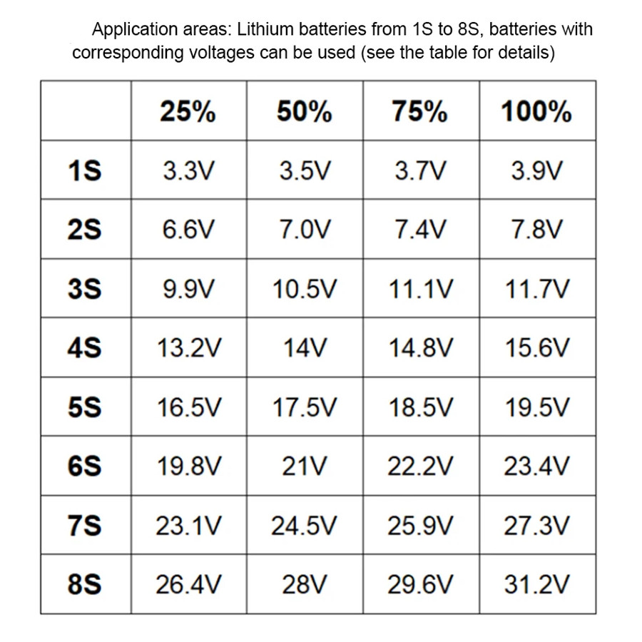 Oblasti použití lithiové baterie od 1S do 8S, lze použít baterie s odpovídajícím napětím: