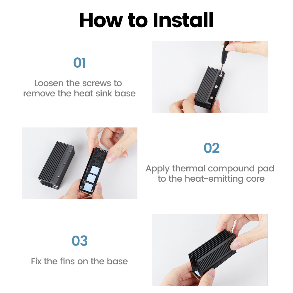 - Když jsou šrouby utaženy, odvod tepla SSD bude rychlejší a měkké podložky tepelné směsi mohou způsobit, že se pevná základna chladiče jemně dotkne SSD, aniž by jej poškodila.